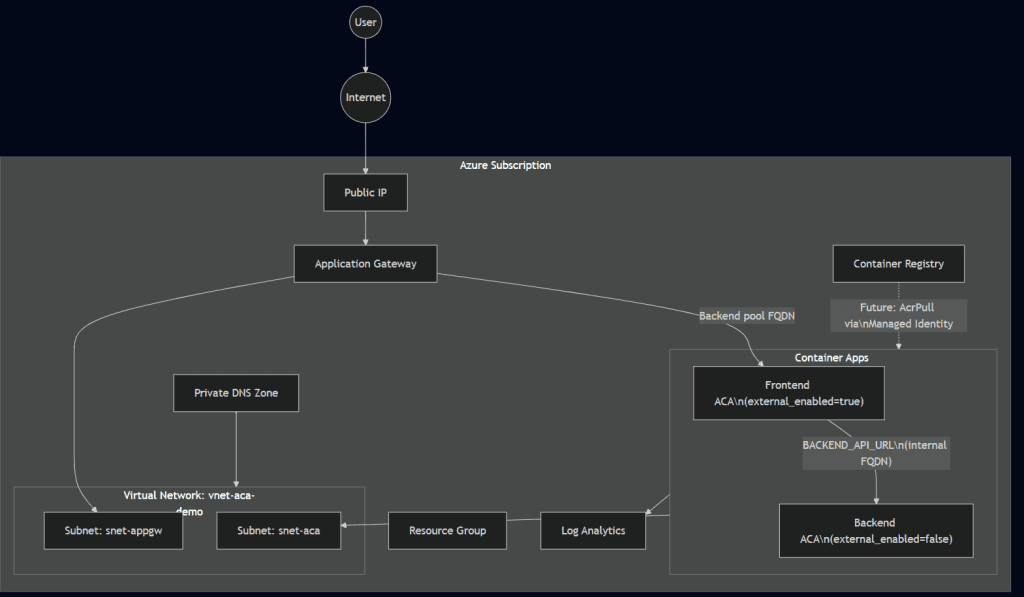 Internet β App Gateway β Frontend ACA β (internal FQDN) β Backend ACA